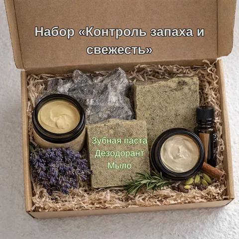 Комплект направлен на устранение причин неприятного запаха и поддержание чистоты кожи. Дезодорант регулирует потоотделение и нейтрализует запах, мыло глубоко очищает кожу, зубная паста усиливает ощущение свежести. Подходит для активного образа жизни.